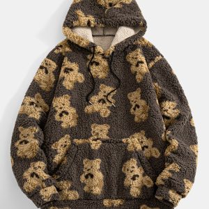 Men’S Cartoon Bear Double-Sided Fleece Long Sleeve Hoodie, Casual Pullover with Fun Ear Design, Kangaroo Pocket, Plush Texture, Perfect for Autumn and Winter, Ideal Gift