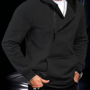 Men’s Thermal Fleece-Lined Hooded Sweatshirt – Thick Winter Pullover with Half-Zip Front, Kangaroo Pocket & Ribbed Cuffs, Casual Solid Color for Cold Weather