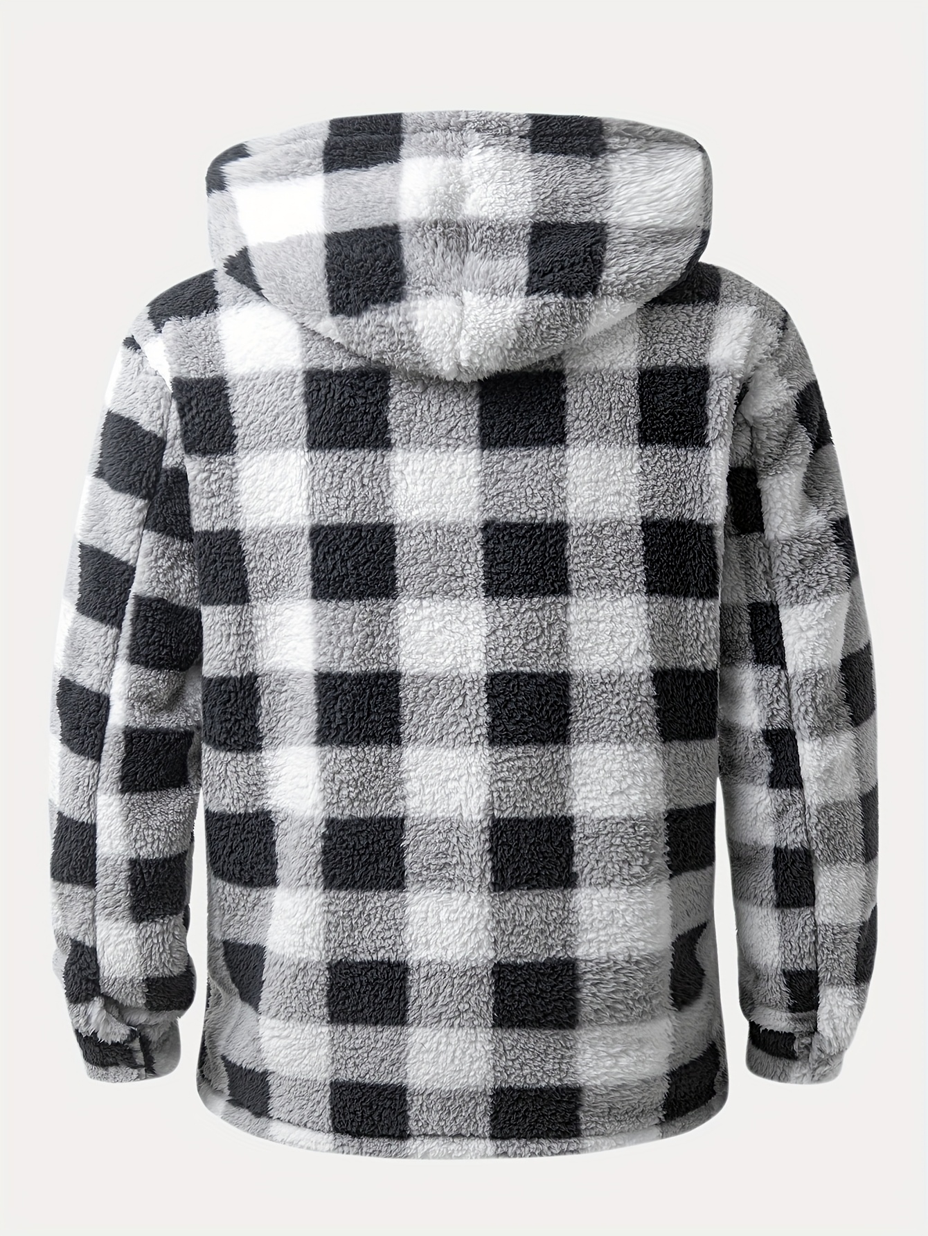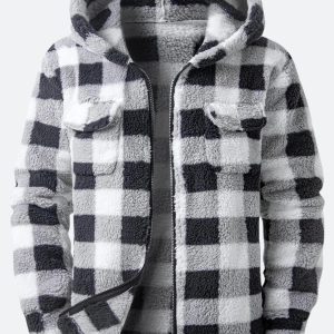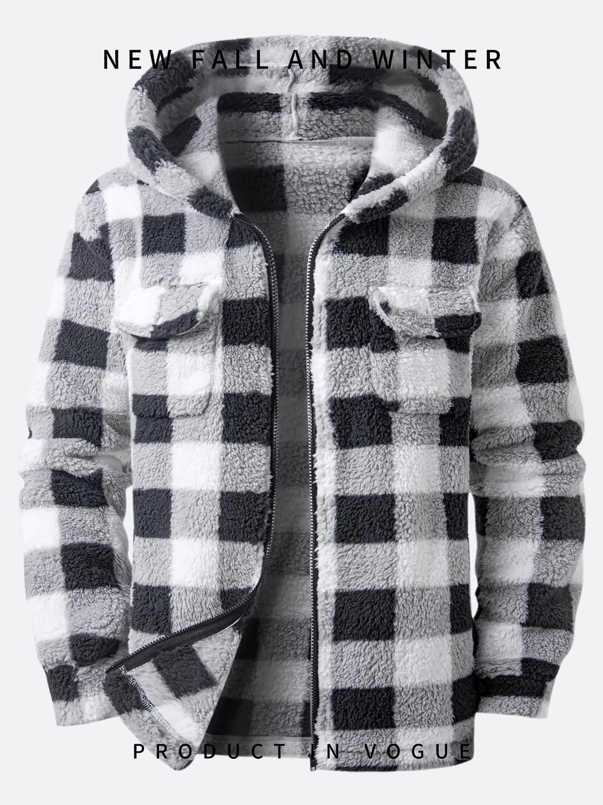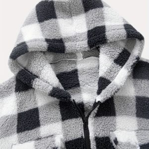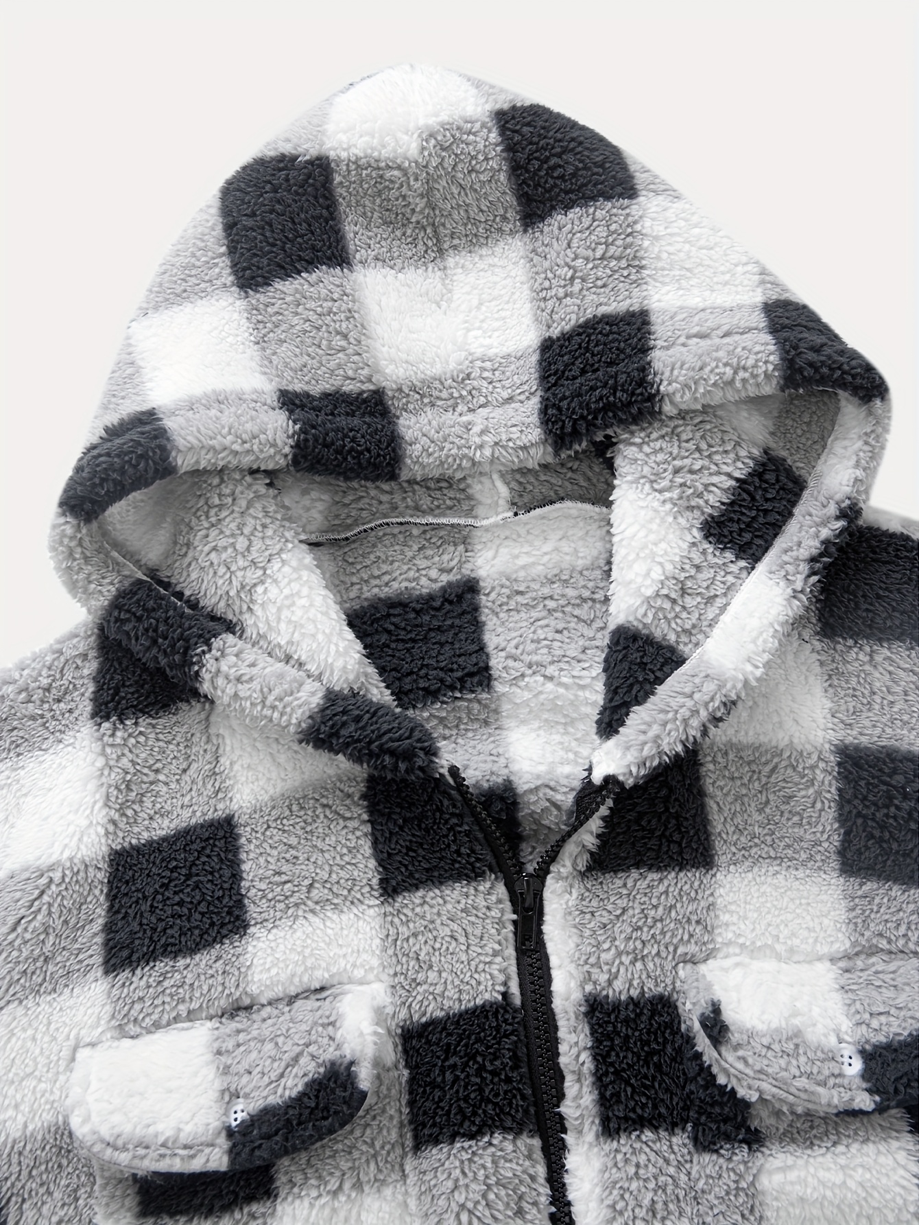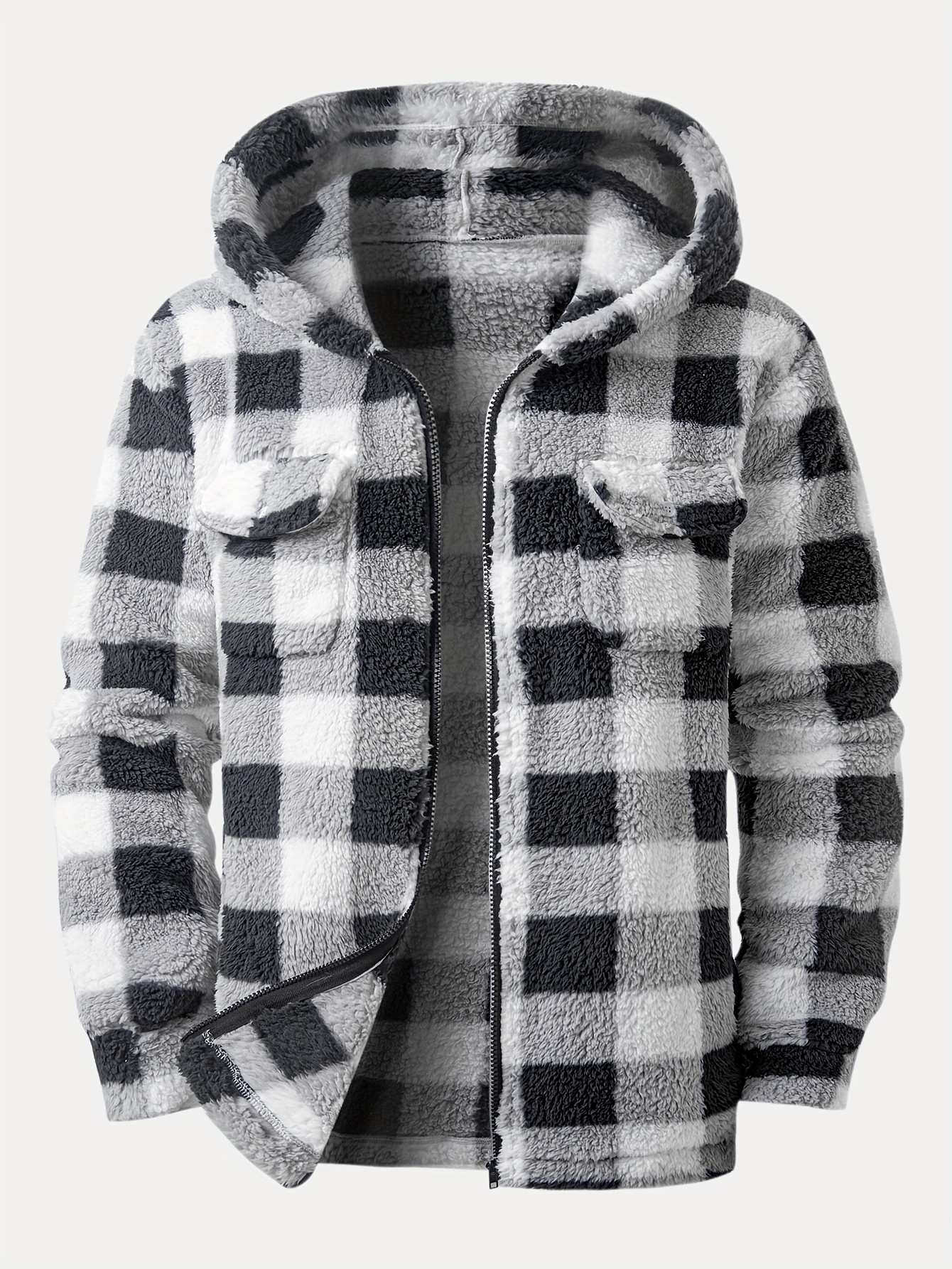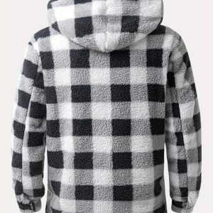 1pc Men’S Double-Sided Plush Plaid Zip-Up Hoodie – Casual Loose Fit, Long Sleeve, Black & White Checkered Pattern, Front Pocket, Zipper Closure, Soft Flannel Fabric, Perfect for Fall & Winter, Autumn Casual Wear | Checkered Pattern Hoodie | Soft Flannel Hoodie