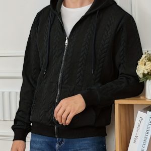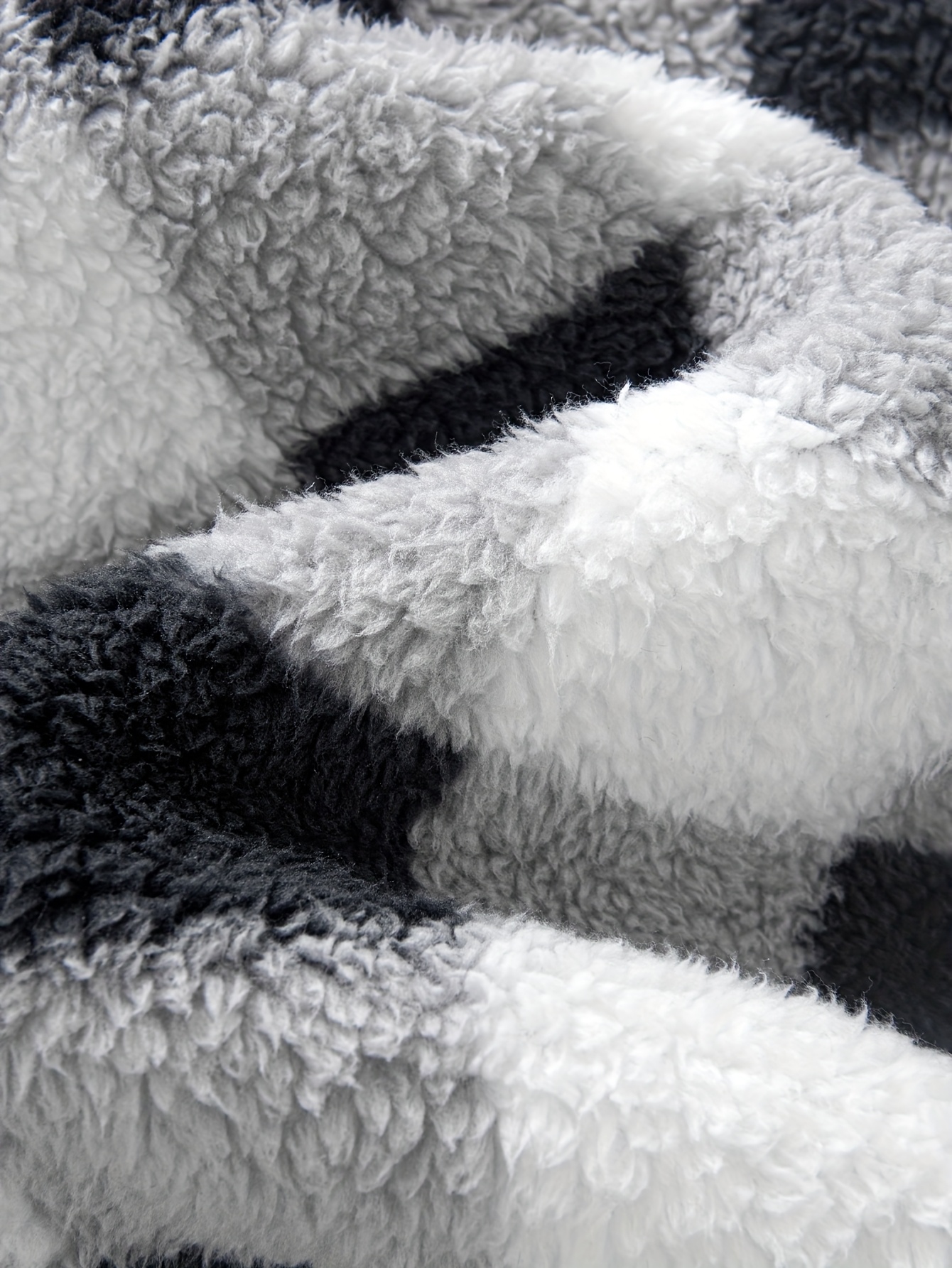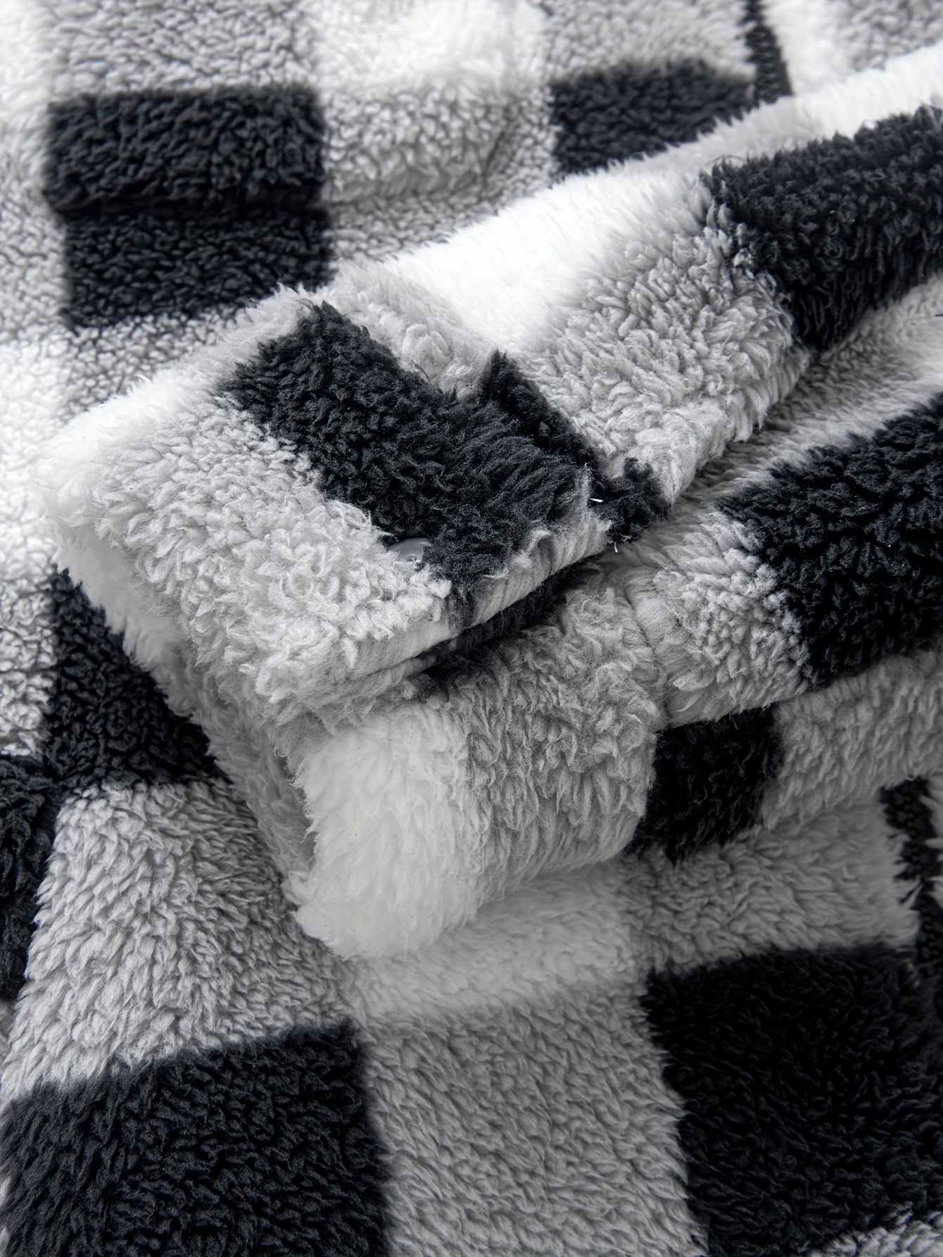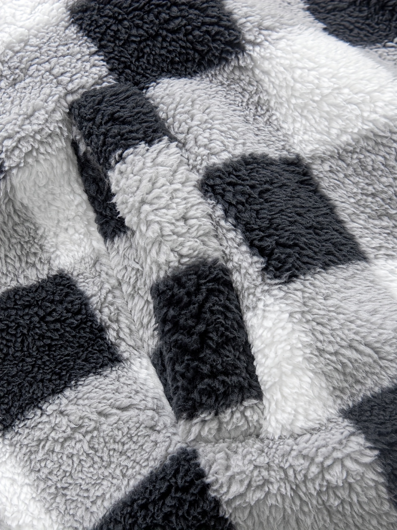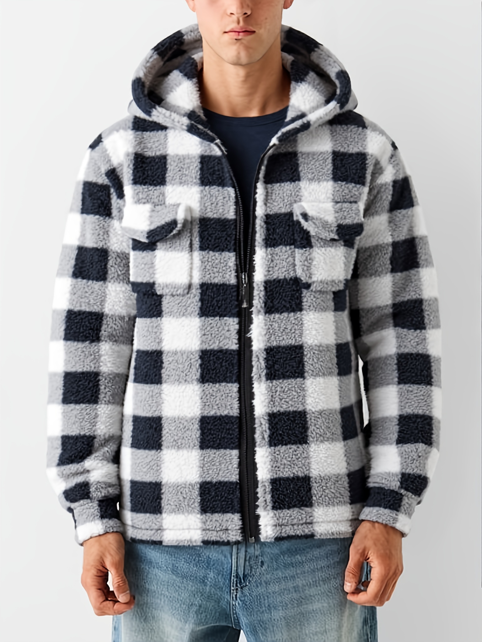 1pc Men’S Double-Sided Plush Plaid Zip-Up Hoodie – Casual Loose Fit, Long Sleeve, Black & White Checkered Pattern, Front Pocket, Zipper Closure, Soft Flannel Fabric, Perfect for Fall & Winter, Autumn Casual Wear | Checkered Pattern Hoodie | Soft Flannel Hoodie
