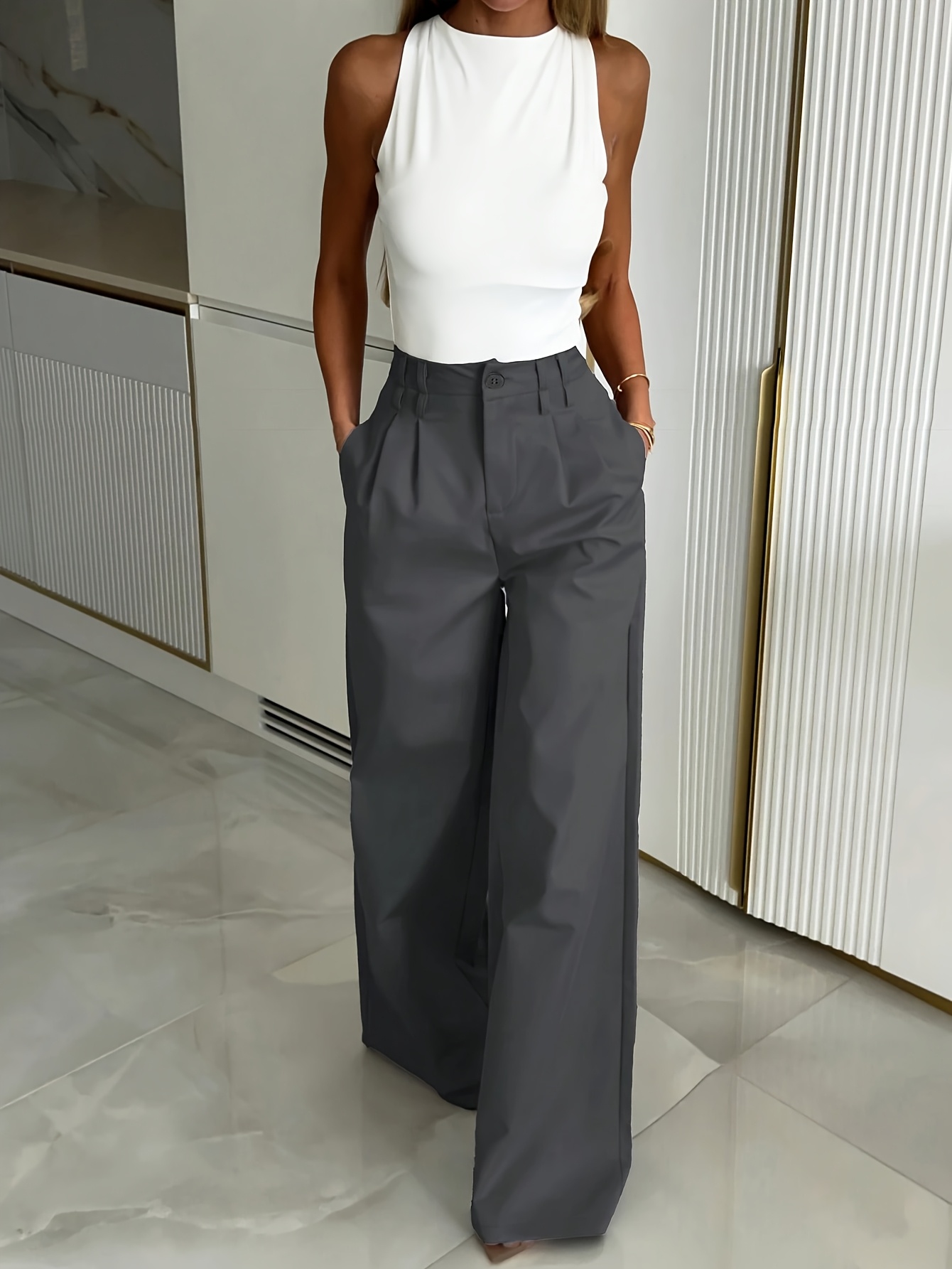 - Fashionable Casual Wide-Leg Trousers with Pockets and Zipper Design | Solid Color, Suitable for Springu002FFall