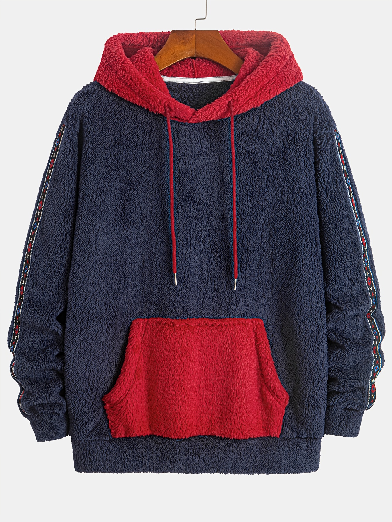 Men’S Fleece-Lined Hooded Sweatshirt in Dark Blue for Autumn And Winter, Featuring an Ethnic Style, Diamond Jacquard Sleeves, a Kangaroo Pocket with Contrasting Colors, And a Loose, Warm Design Suitable for Couples on Instagram.