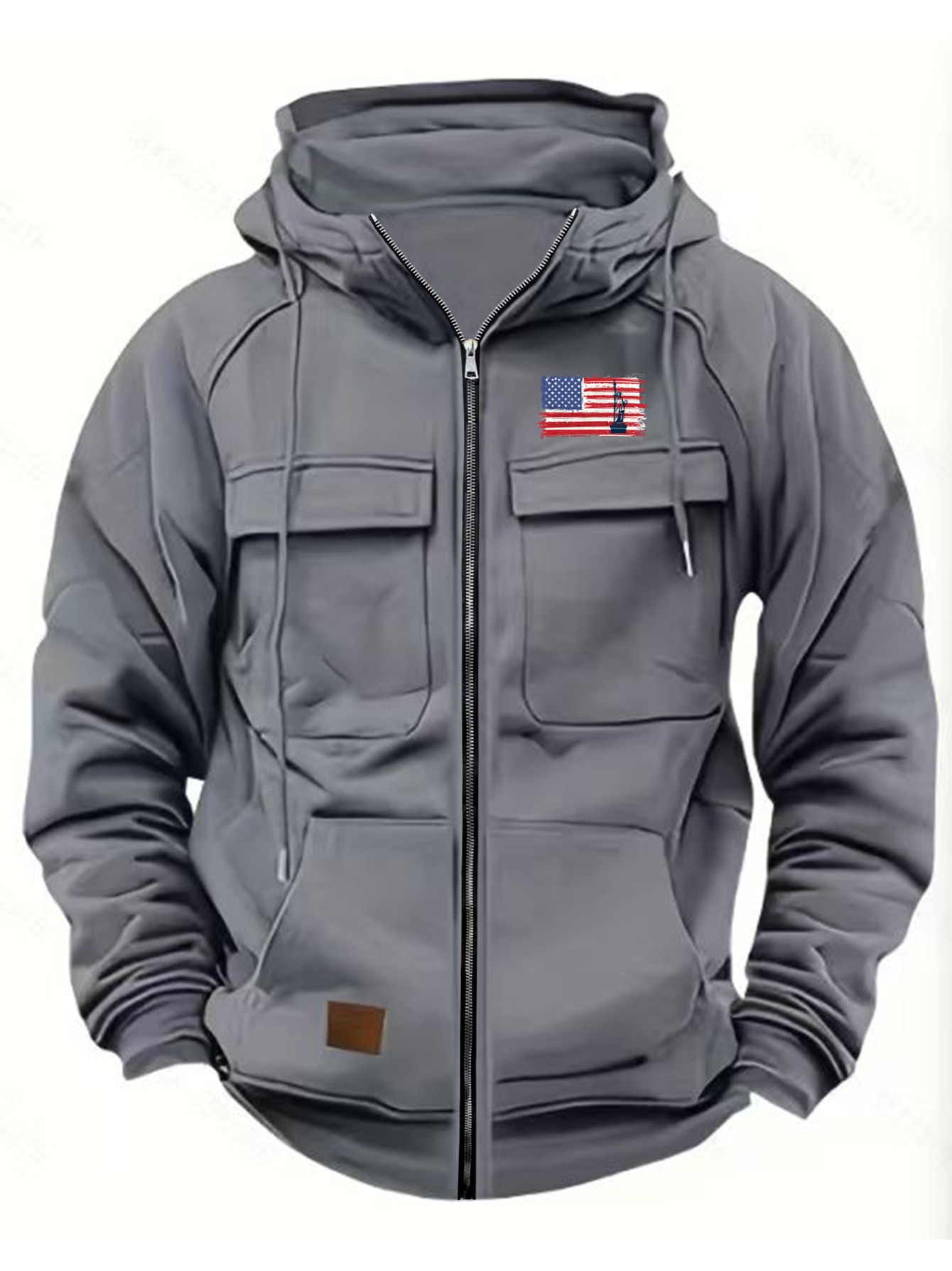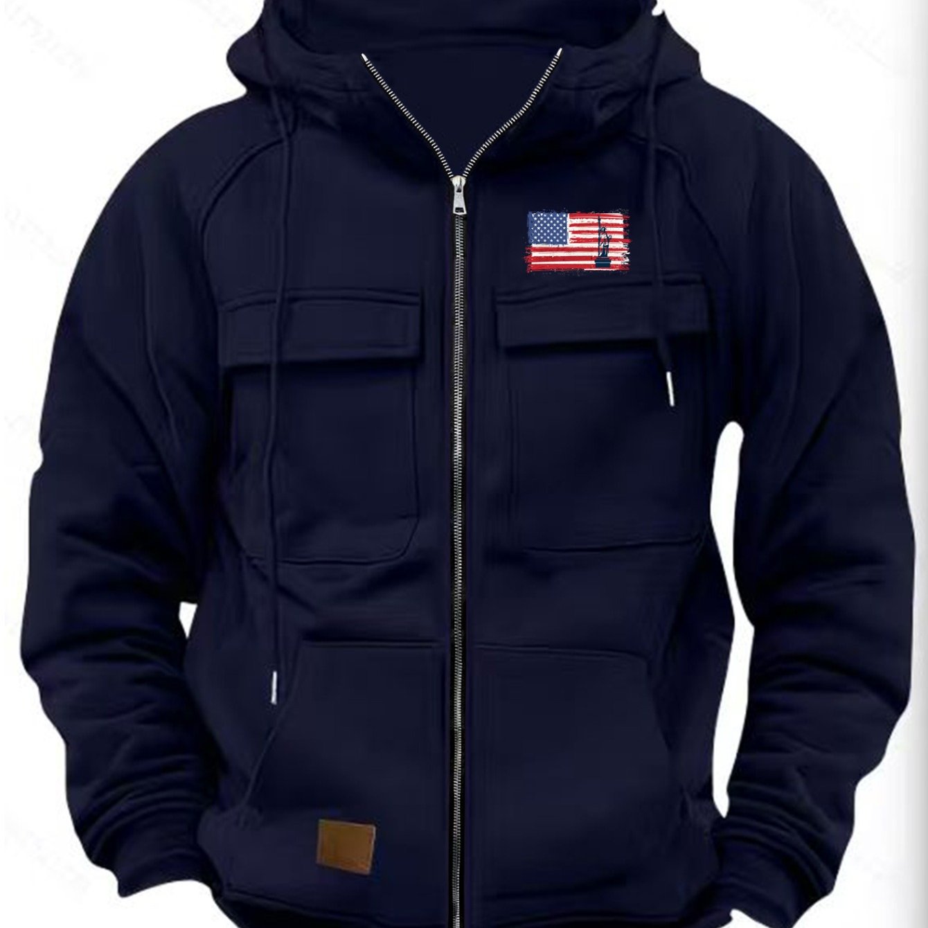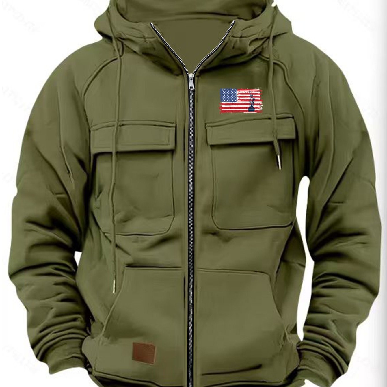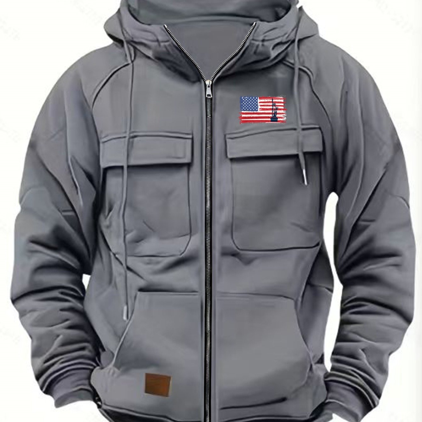 Men’s Long Sleeve Zip-Up Hooded Sweatshirt with Multiple Pockets, American Flag and Statue of Liberty Print, Fashionable Outdoor Sport Jacket for Autumn, Winter, and Spring