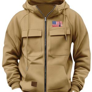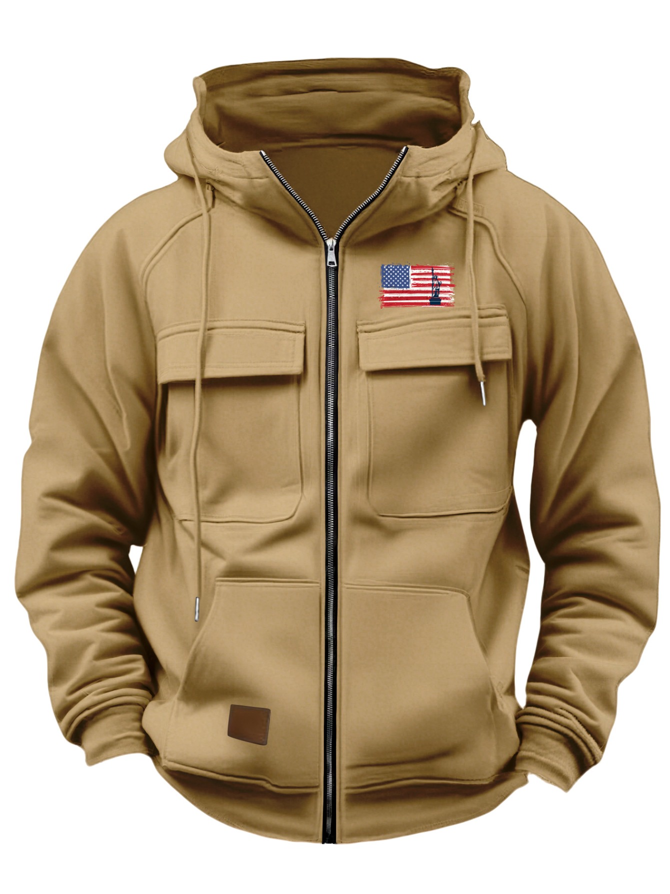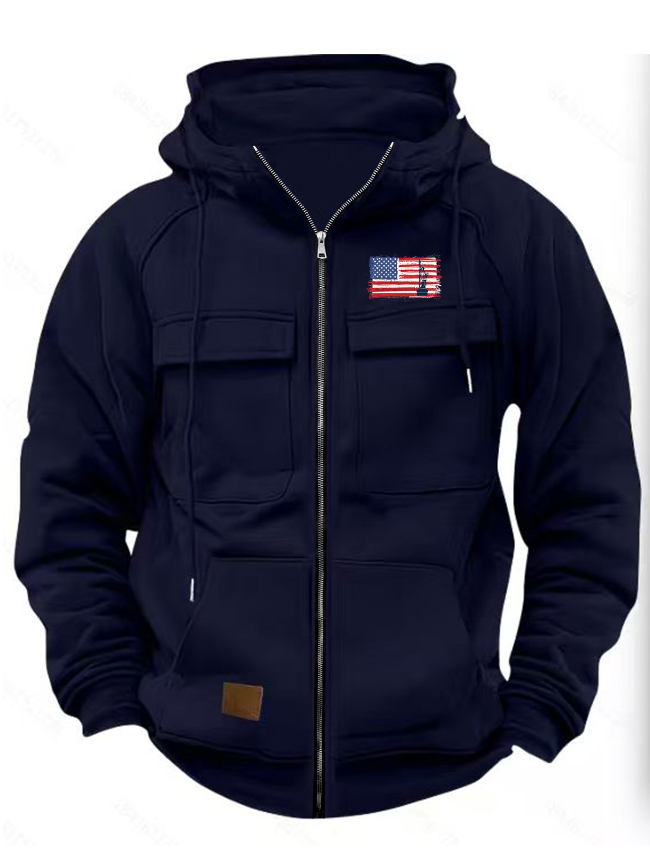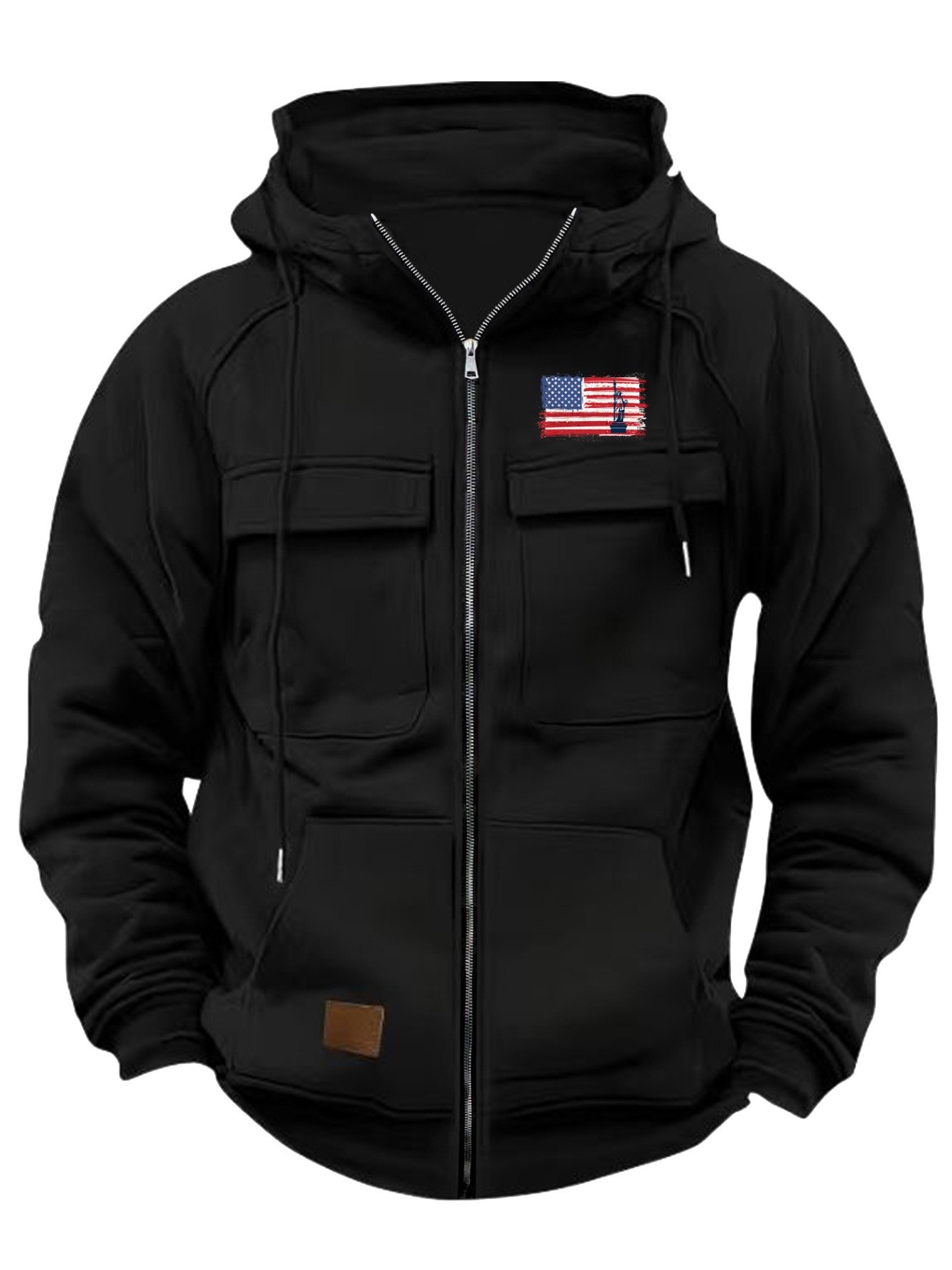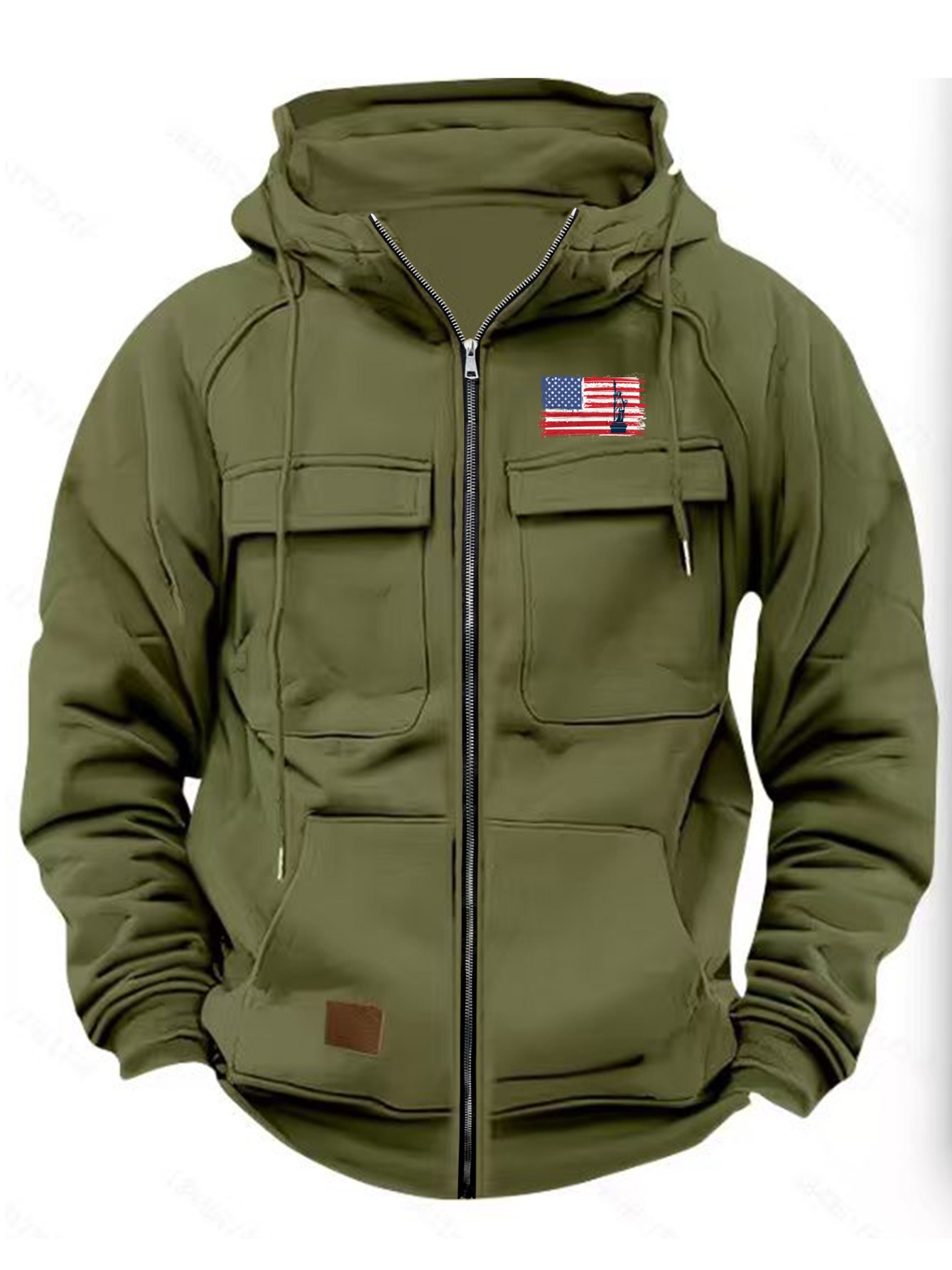 Men’s Long Sleeve Zip-Up Hooded Sweatshirt with Multiple Pockets, American Flag and Statue of Liberty Print, Fashionable Outdoor Sport Jacket for Autumn, Winter, and Spring