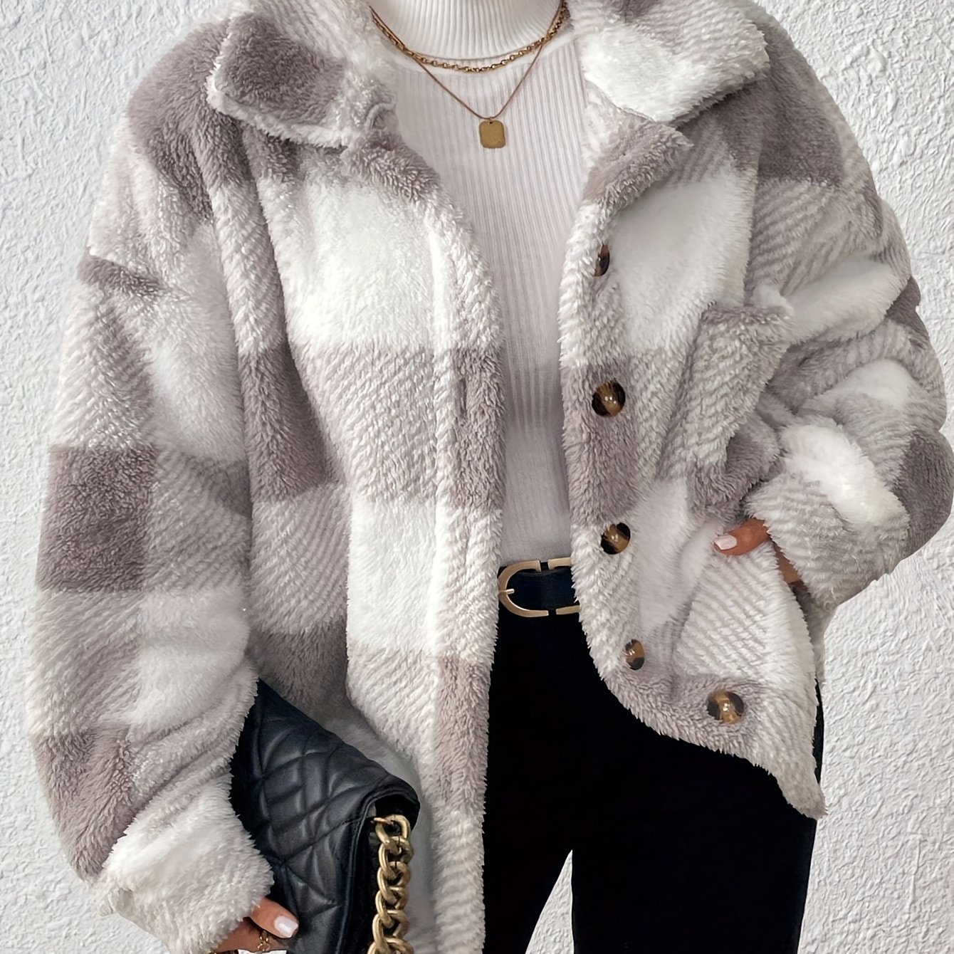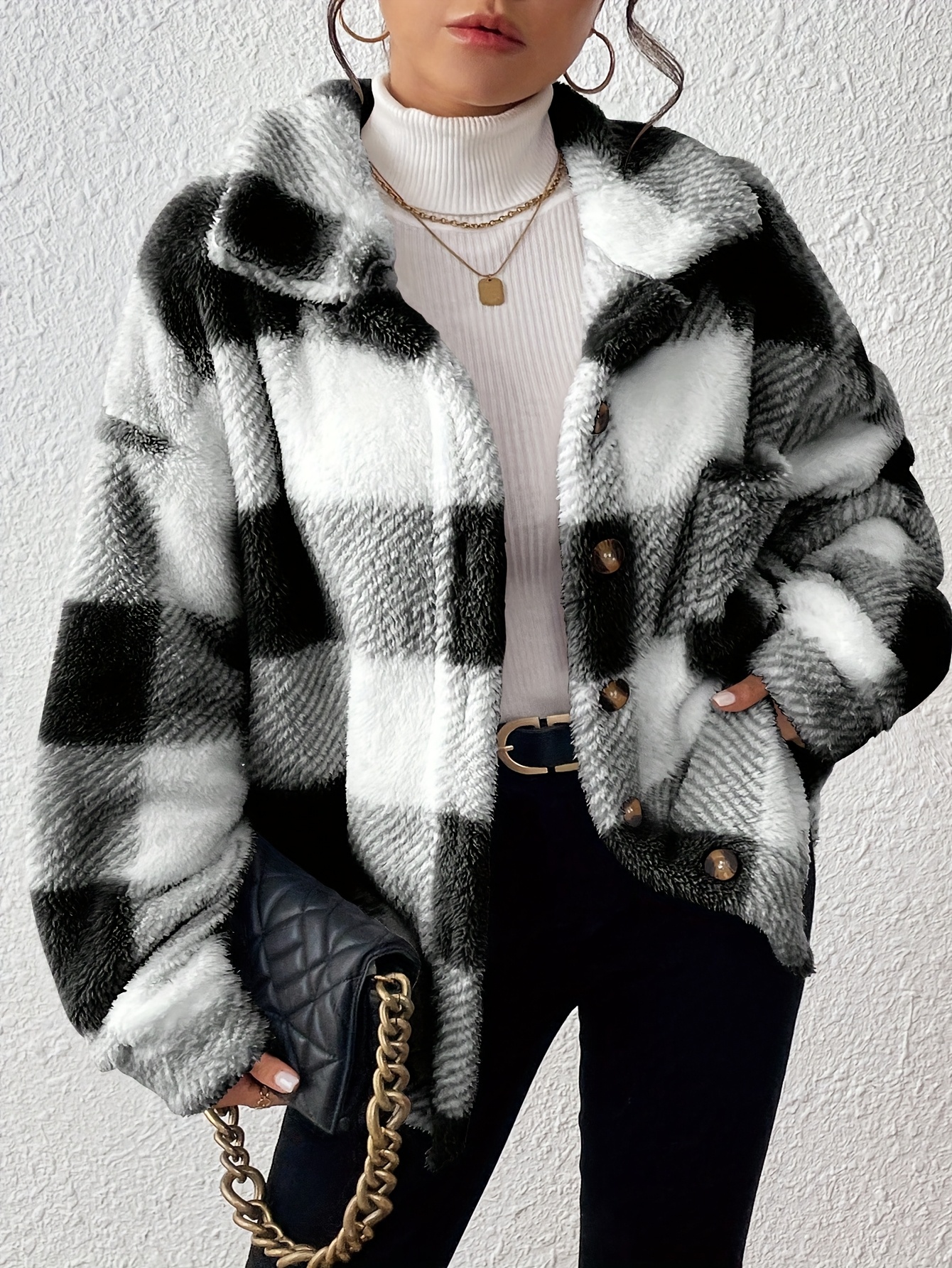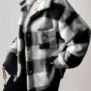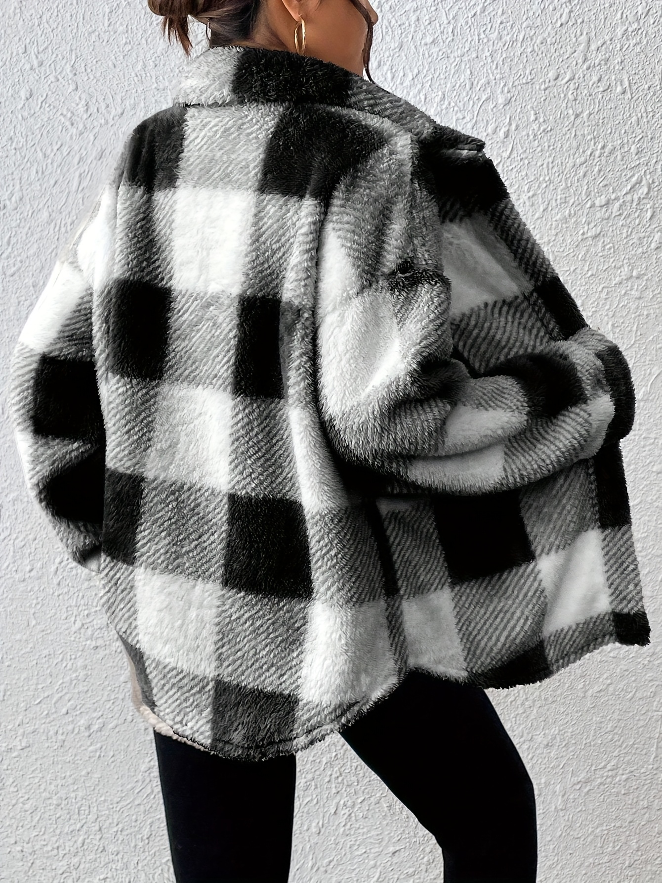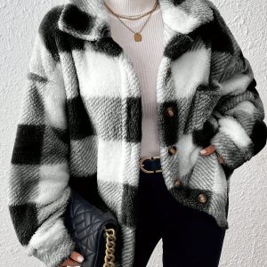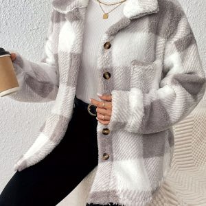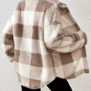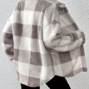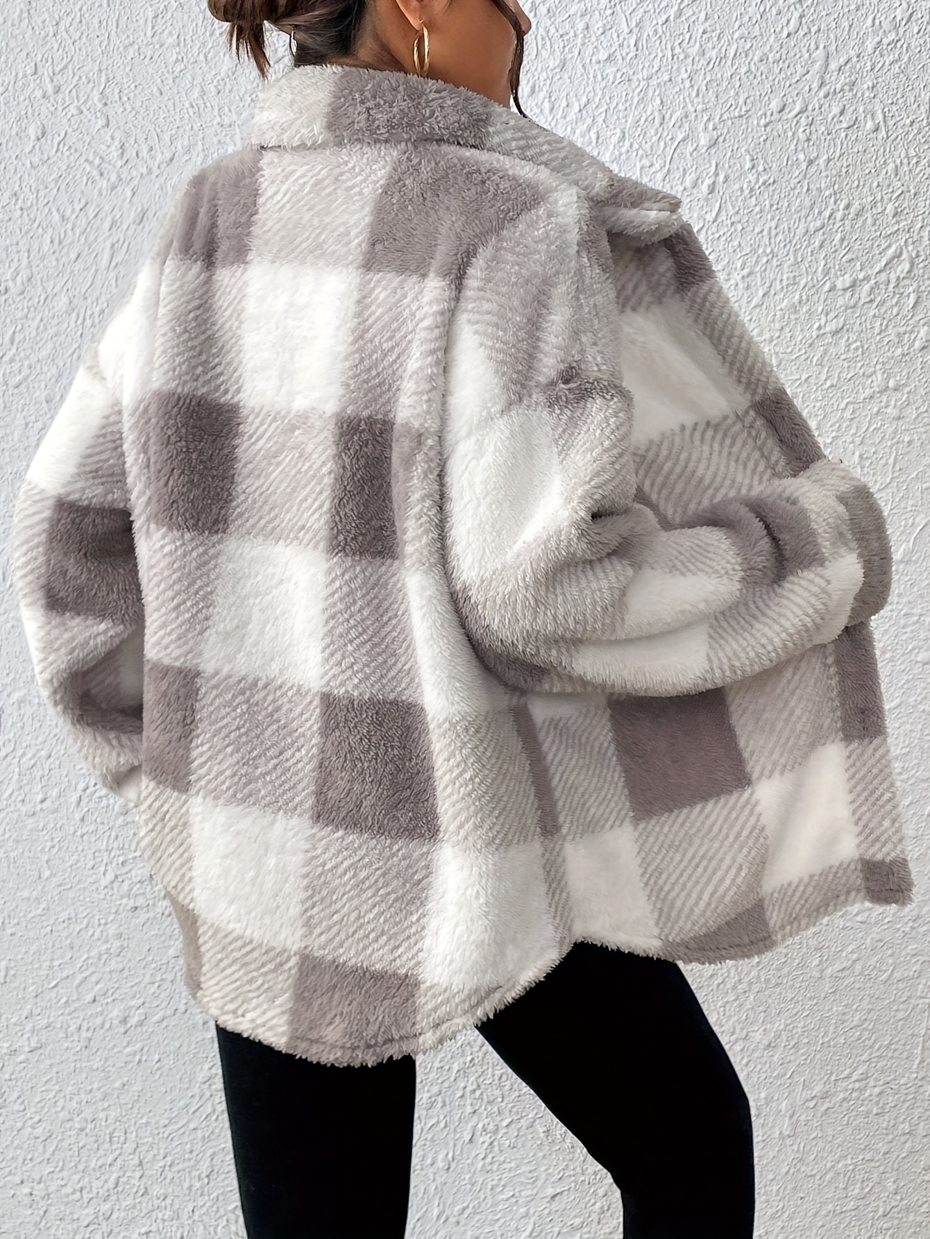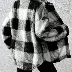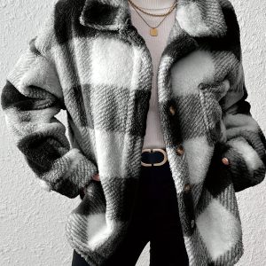 Plus Size – Plus-Size Women’S Long-Sleeve Checkered Jacket, Casual Outerwear for Autumn And Winter, Warm And Stylish.