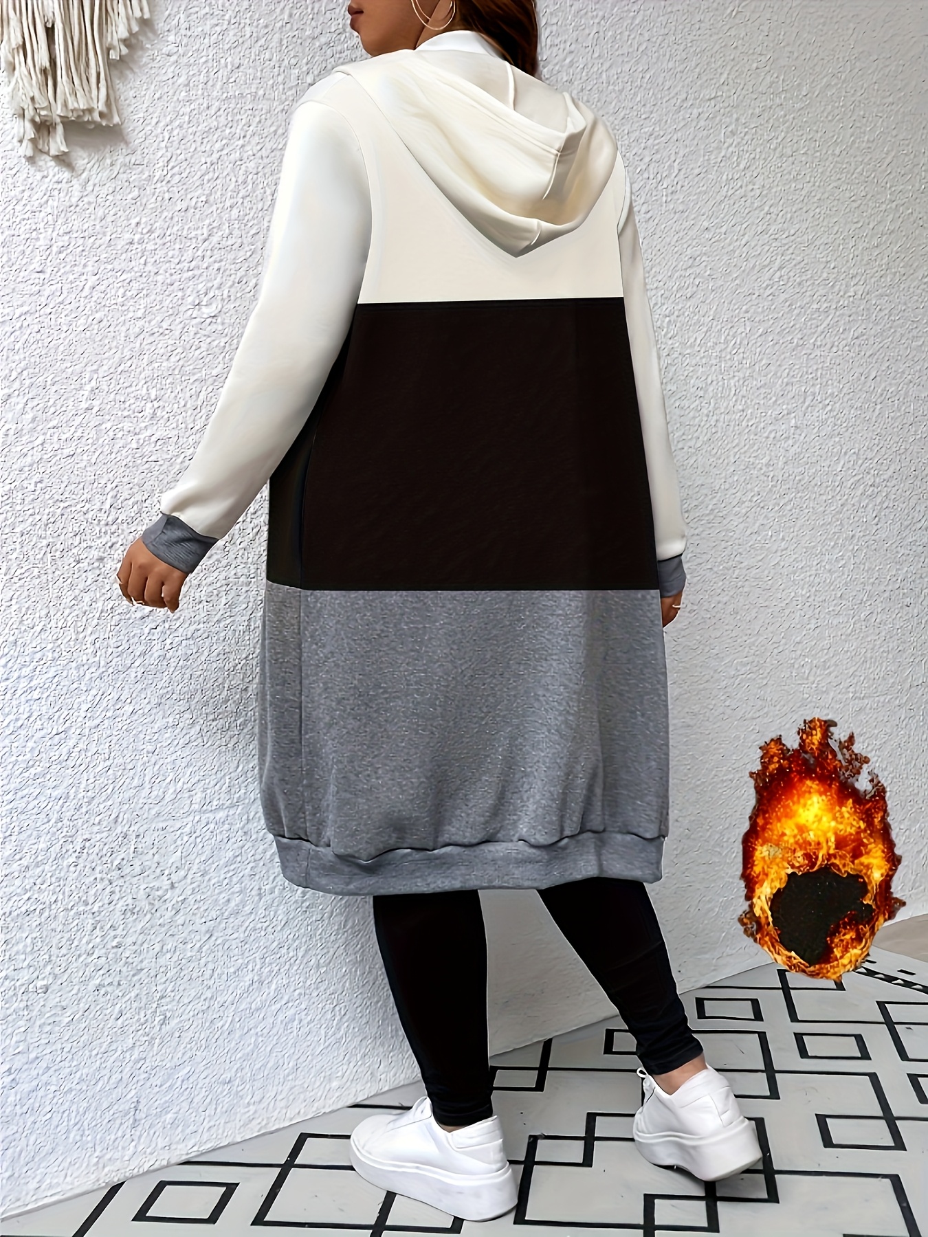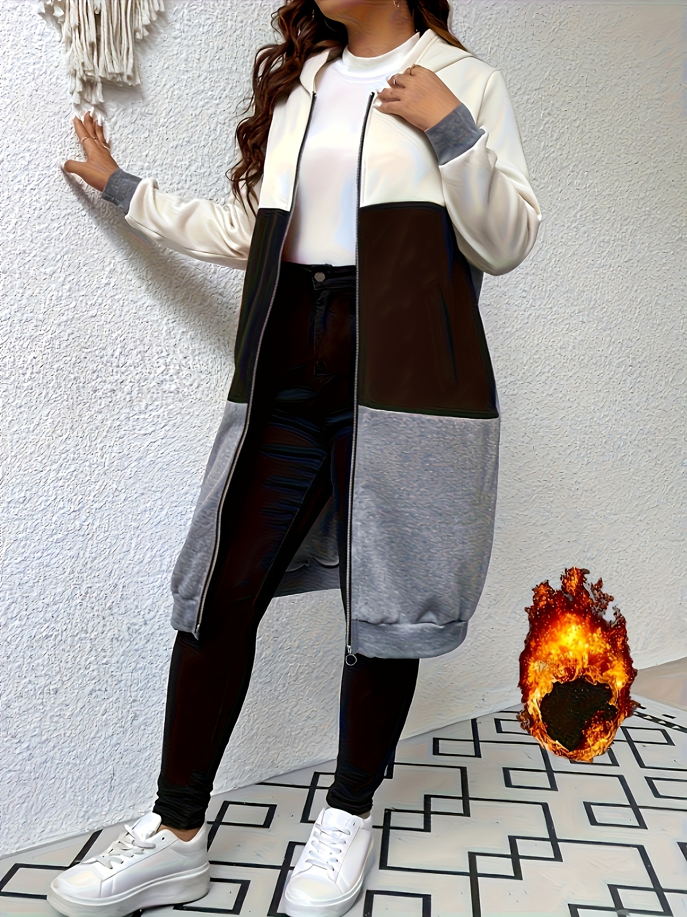 Plus Size, Women’s Hooded Long Coat – Blacku002FWhiteu002FGrayu002F – Zipper Front Closure, Side Pockets – Machine Washable Winter Outerwear for Everyday & Formal Events – Chic Women’s Clothing, Seasonal Fashion, Color Block Design, Highquality Stitching, Fashionconscious Women