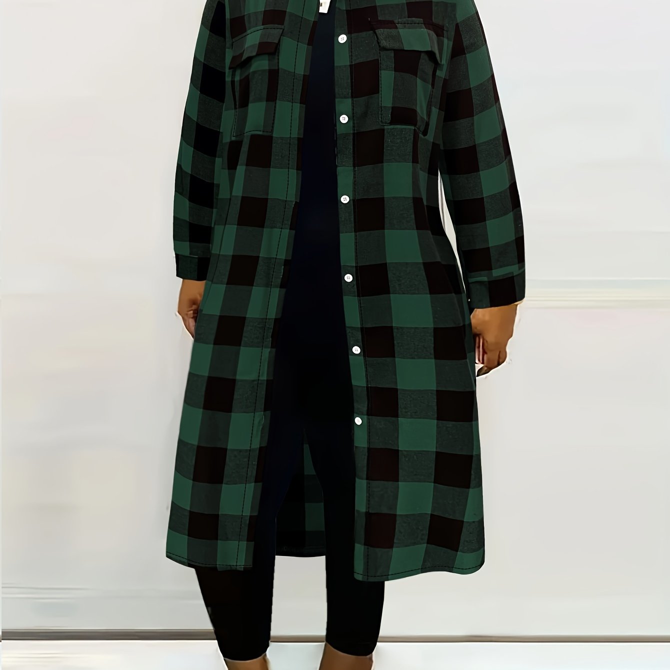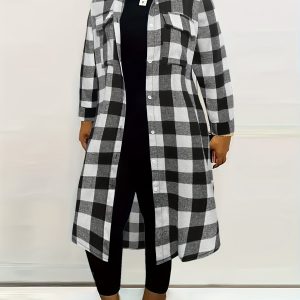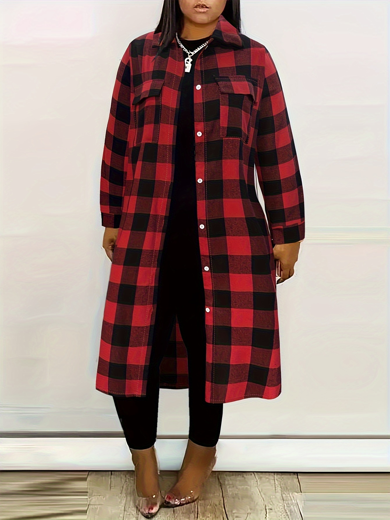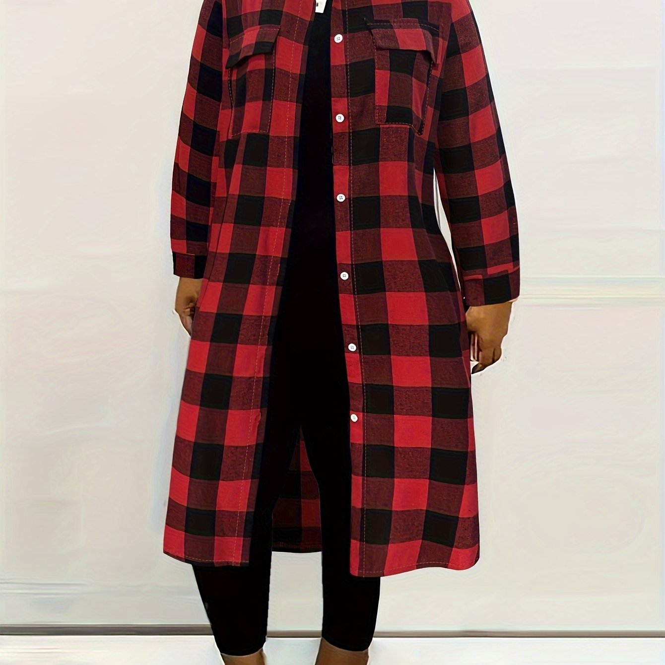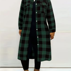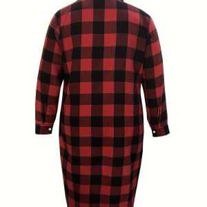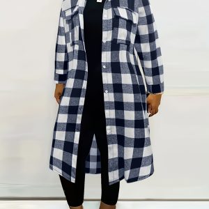 Plus Size, Women’s Plus Size Plaid Button- Overshirt Jacket – Collar Longline Coat with Button Front, Lightweight Warm Fallu002FWinter Topper, Casual Elegant Half-Door Plaid Blouse for Layering (Machine Washable)
