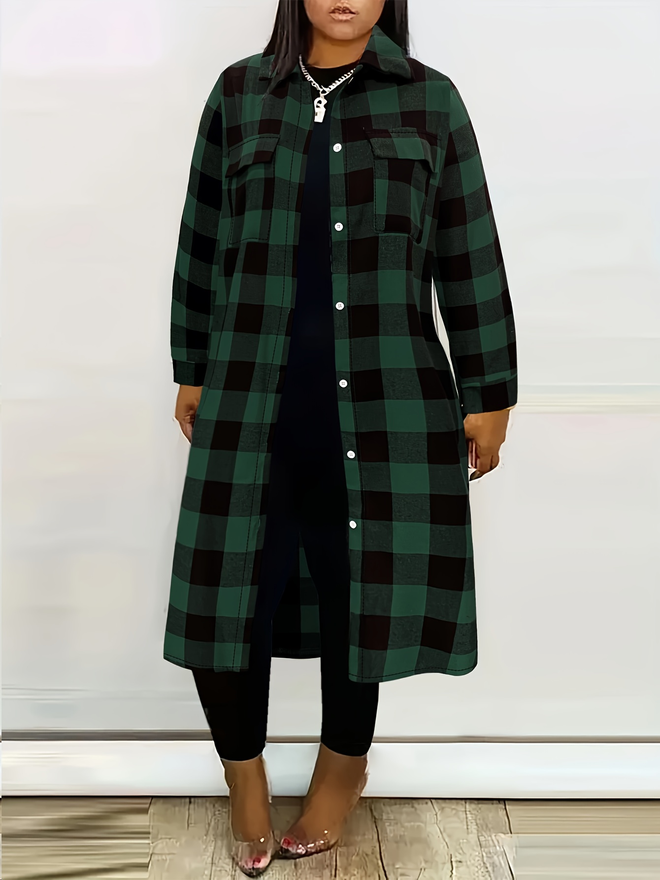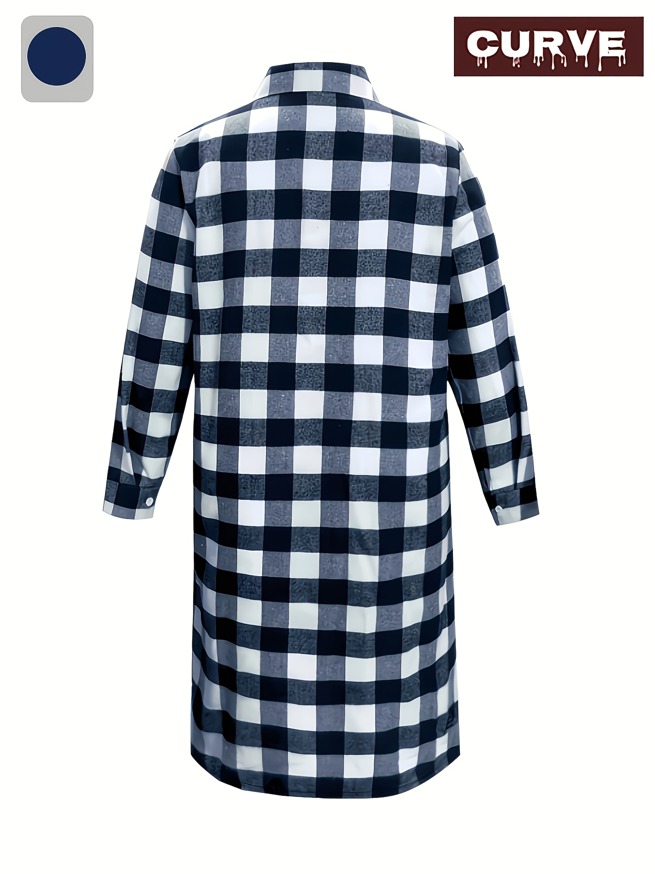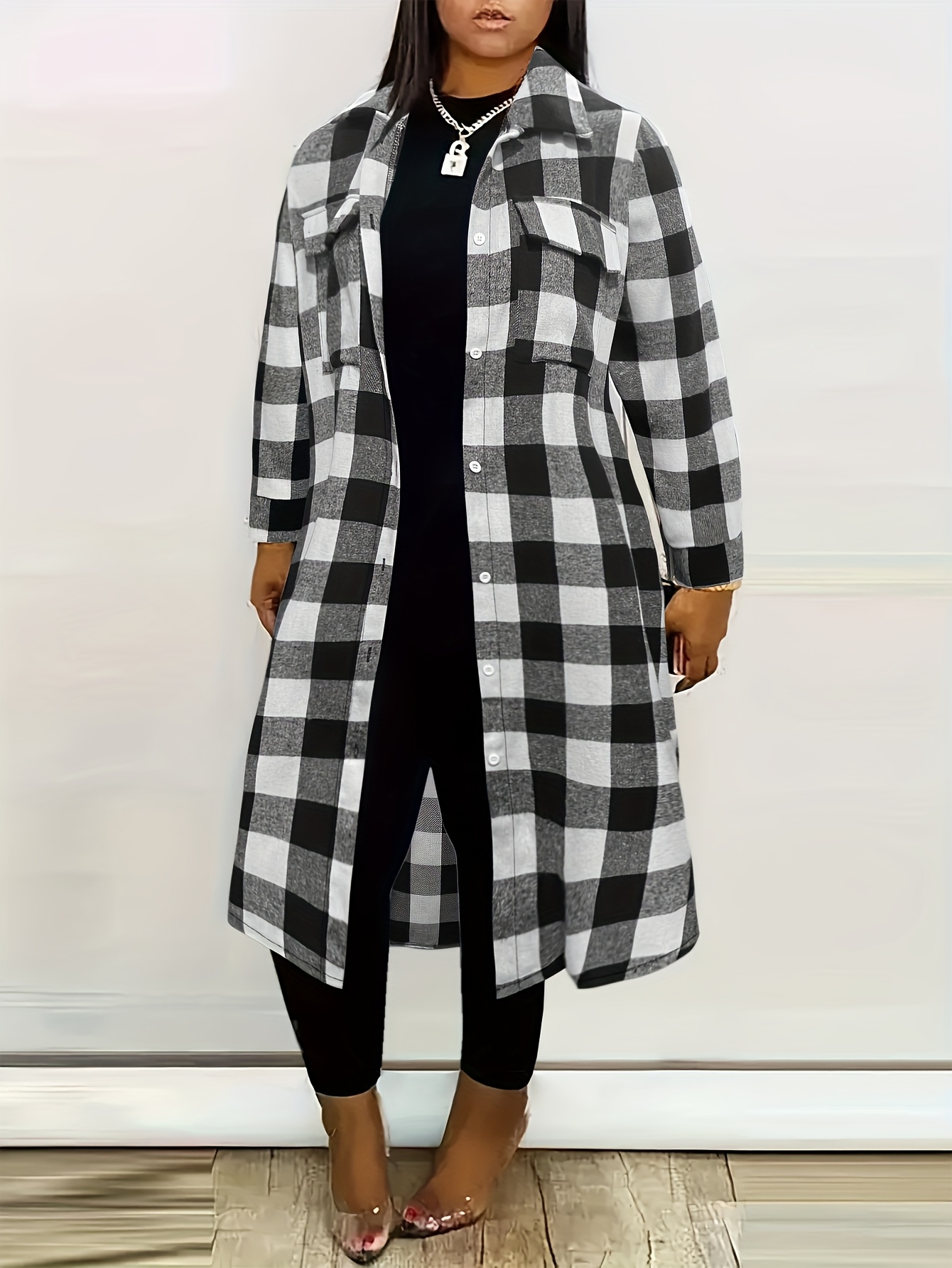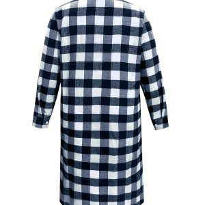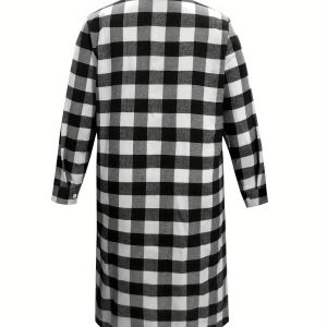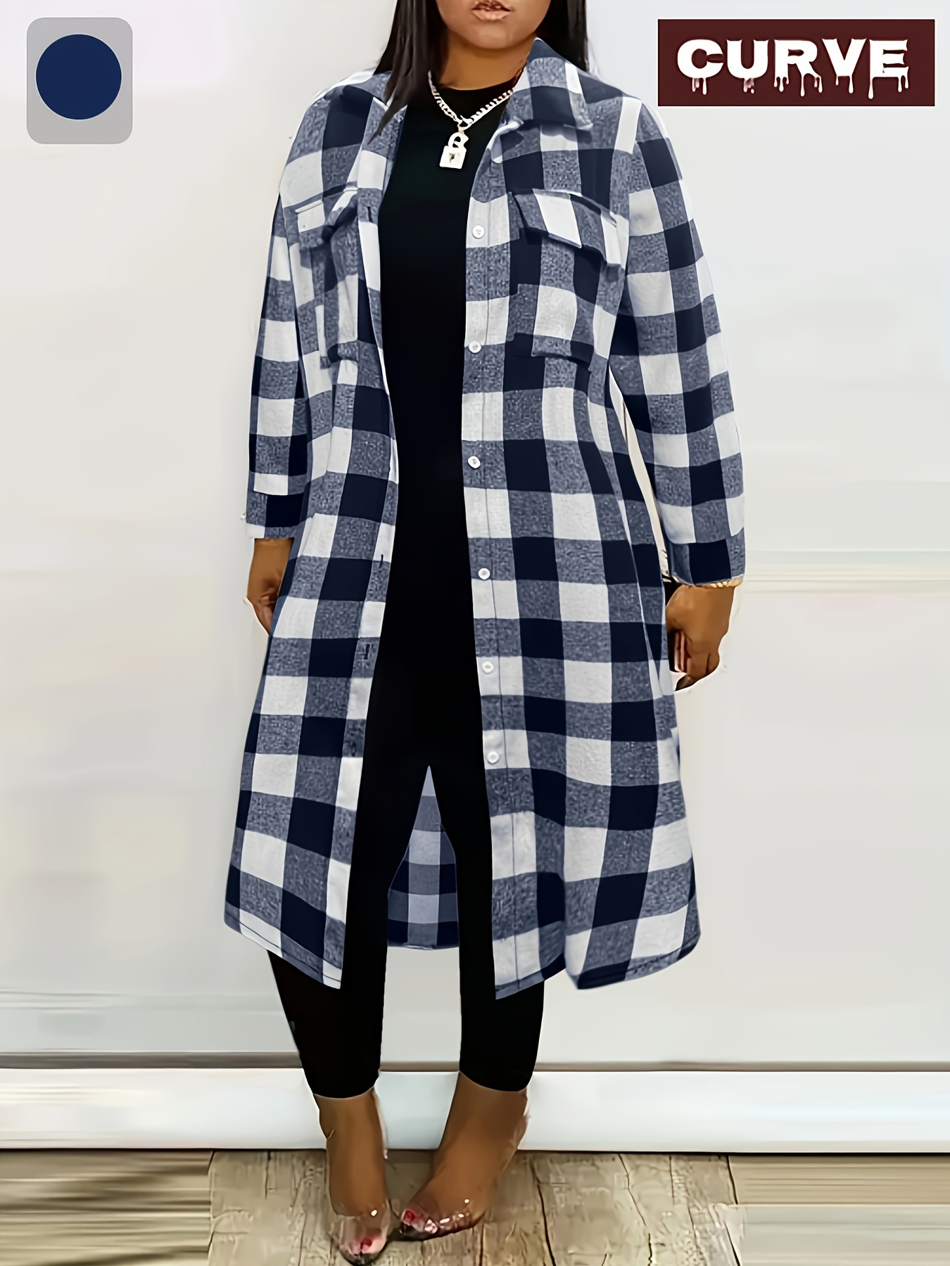Plus Size, Women’s Plus Size Plaid Button- Overshirt Jacket – Collar Longline Coat with Button Front, Lightweight Warm Fallu002FWinter Topper, Casual Elegant Half-Door Plaid Blouse for Layering (Machine Washable)