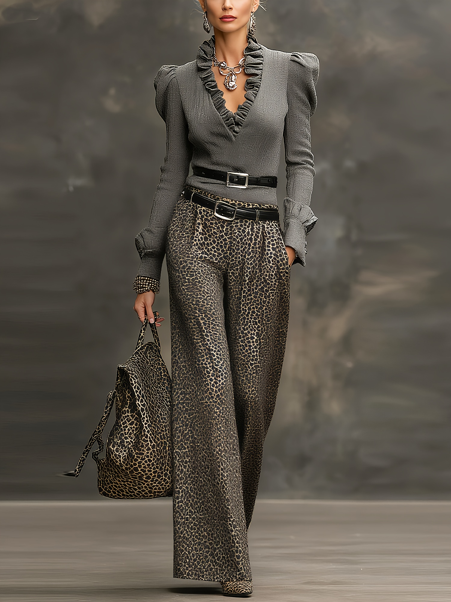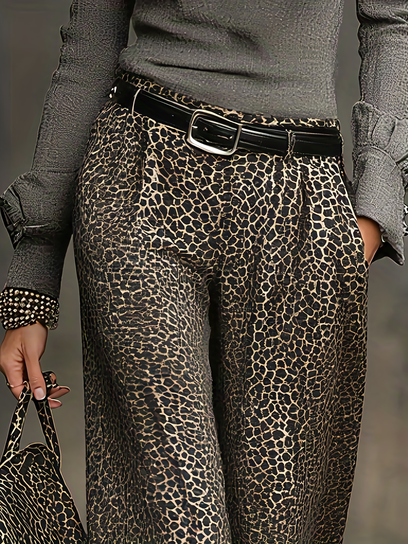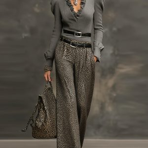 Women’s Elegant Wide-Leg Pants with Full-Length Leopard Print – Beltless Design Maxi Length Trousers Suitable for All-Season Wear, Casual & Dressy Outfits