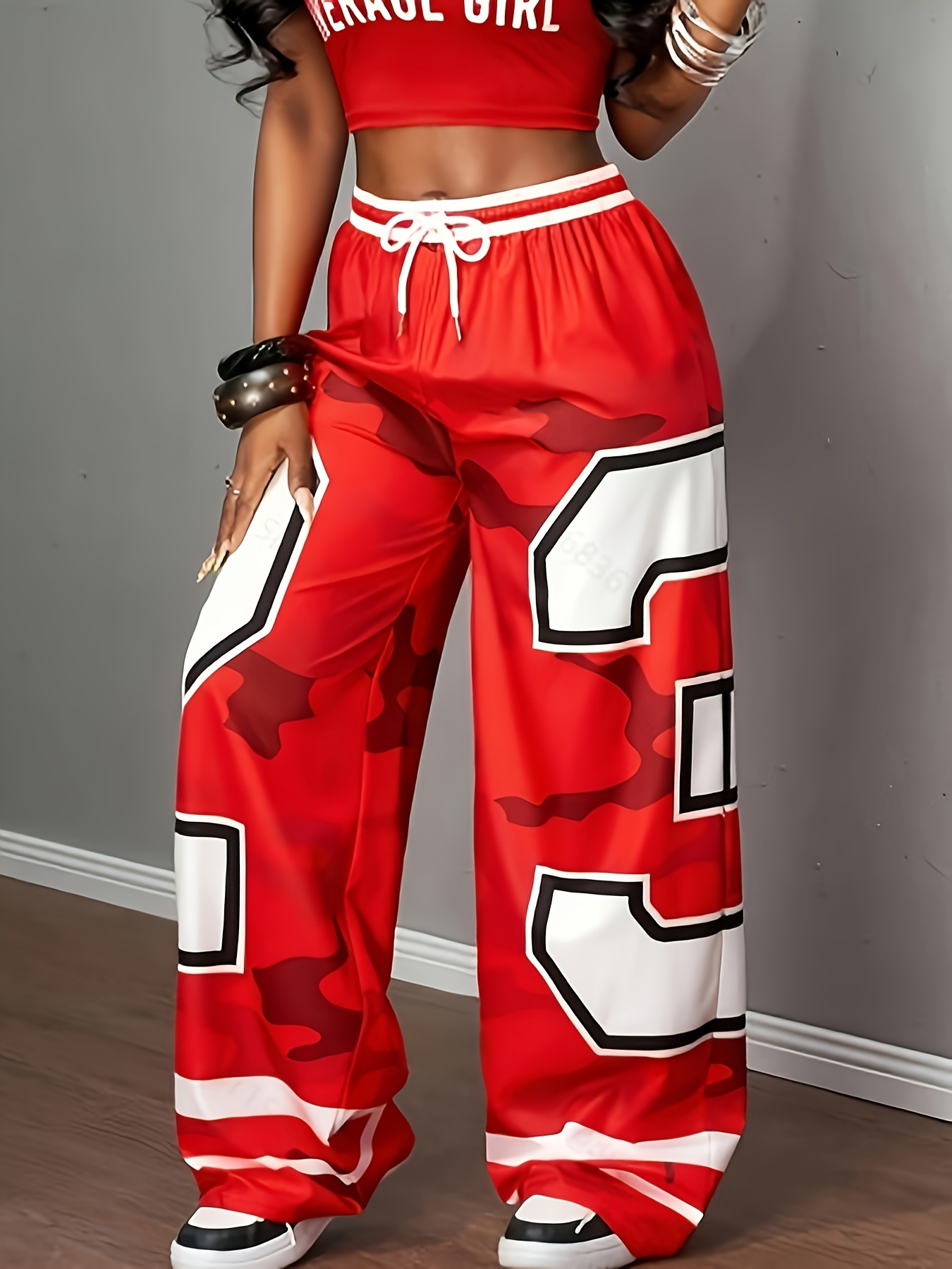 Women’s Wide-Leg Pants – Red & Camo Leggings, Drawstring Waist, Loose Fit Trousers for, Everyday Outfits – Machine Washable Bottoms (Single-Piece)