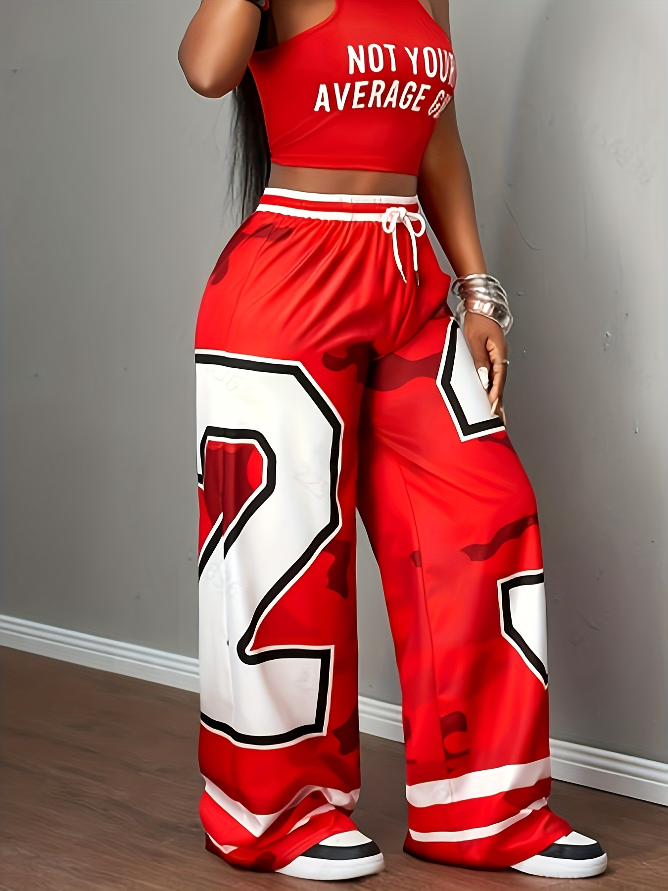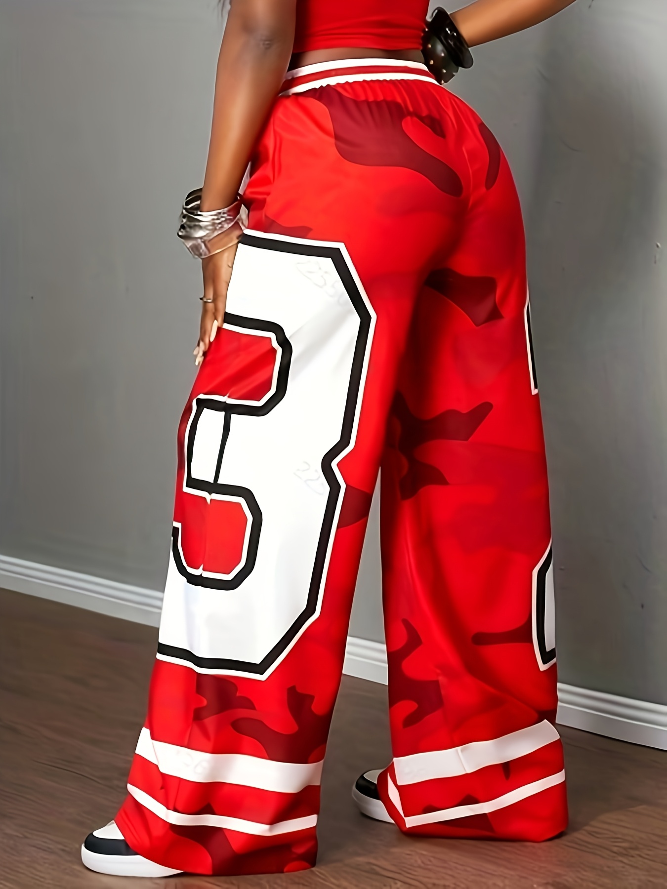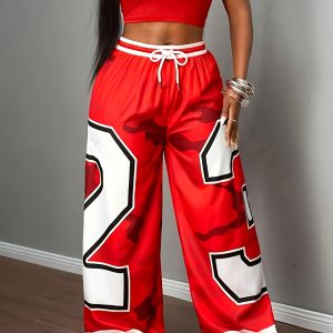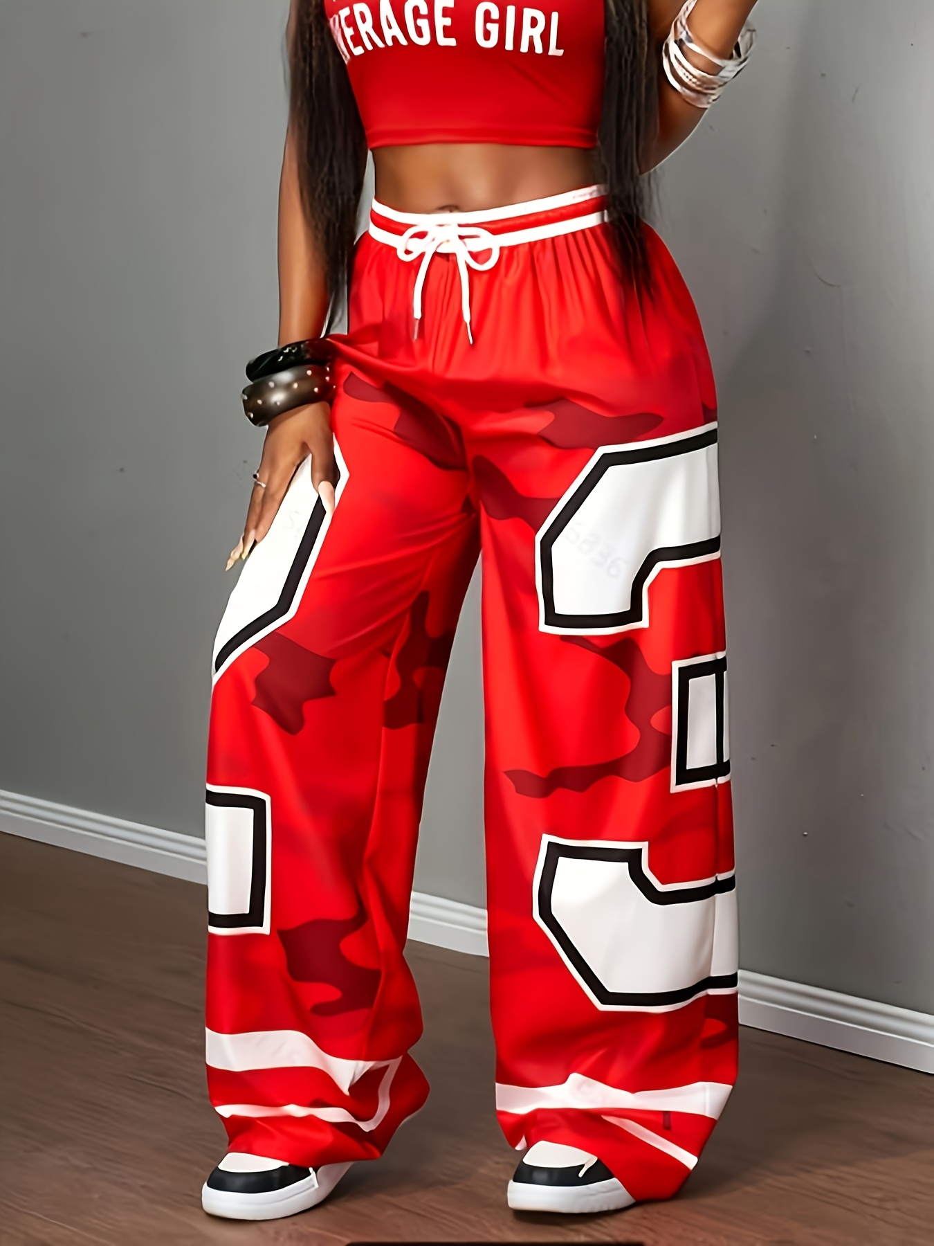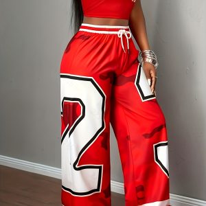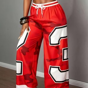 Women’s Wide-Leg Pants – Red & Camo Leggings, Drawstring Waist, Loose Fit Trousers for, Everyday Outfits – Machine Washable Bottoms (Single-Piece)